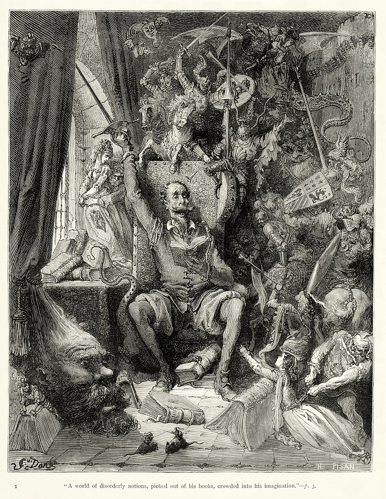 “Our hidalgo himself was nearly fifty; he had a robust constitution, dried up flesh, and a withered face, and he was an early riser and a keen huntsman”.